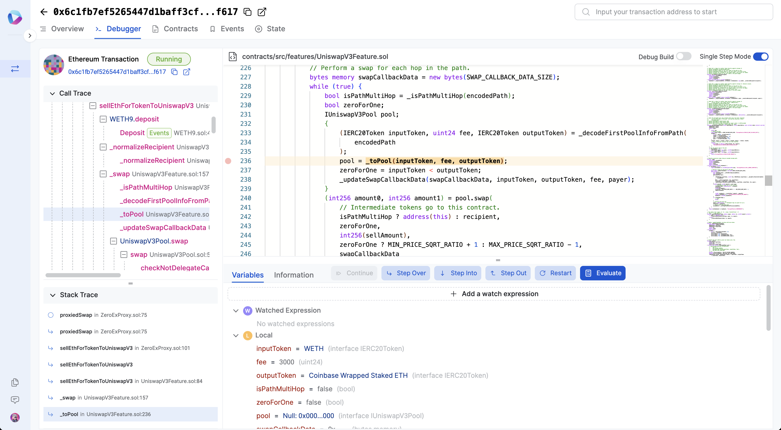 To understand a transaction even further, developers can use the Debugger tab to visualize the execution line-by-line.