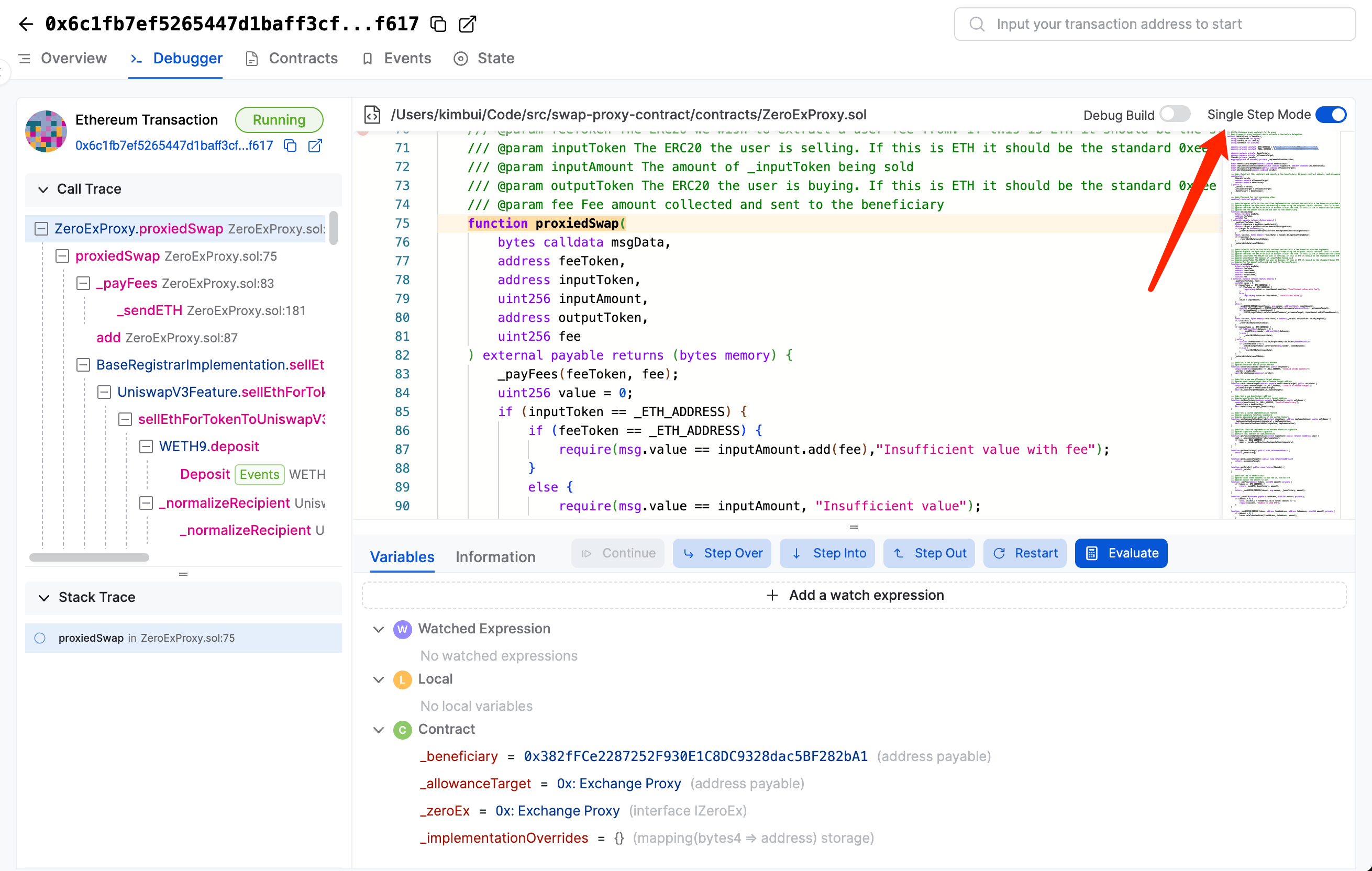 On the upper-left section, Sentio shows the trace of the transaction, this is the same as trace and call. Users can use this to select a location and execute directly to that position.