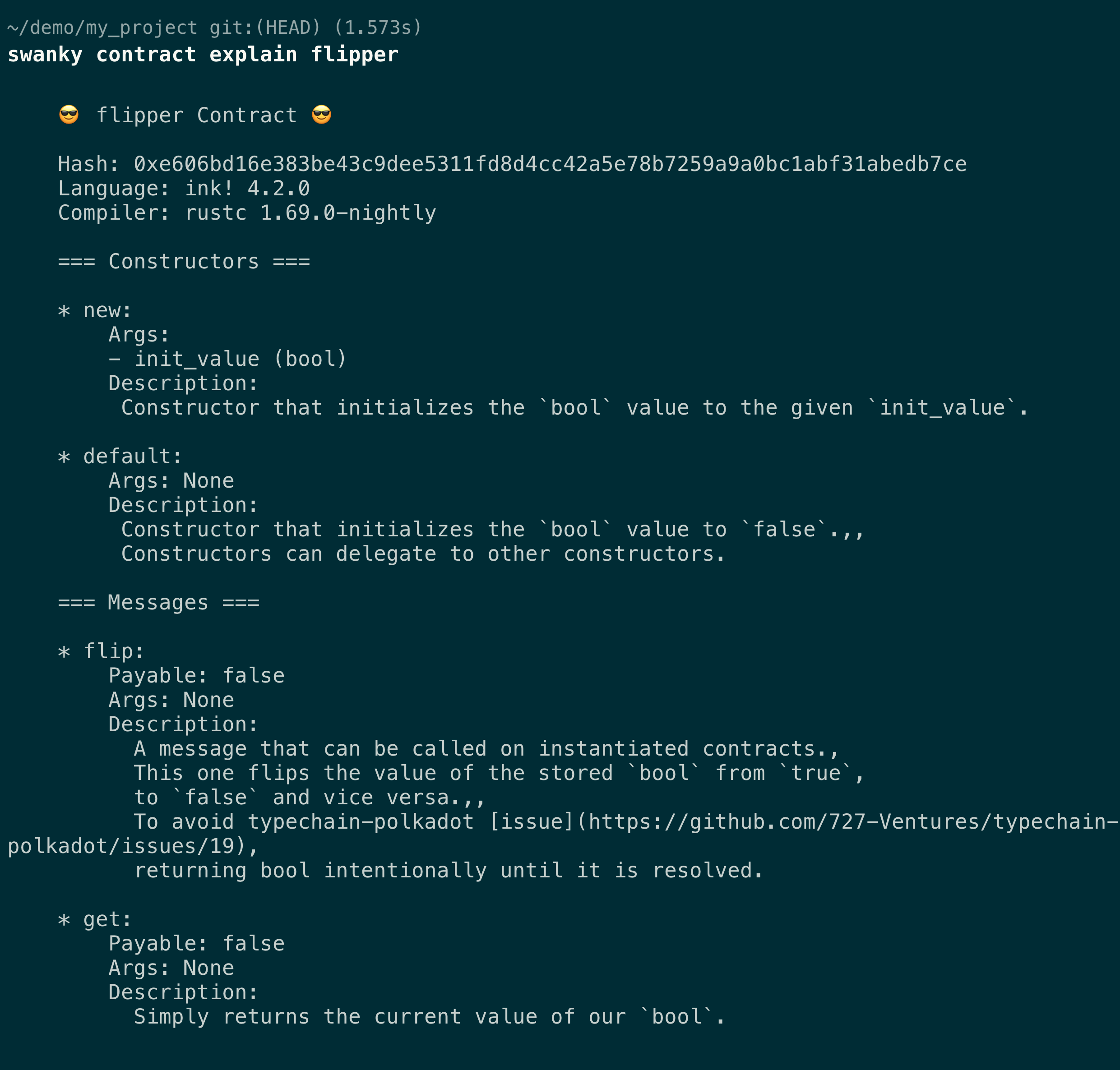 Swanky provides contract explain CONTRACT_NAME command to get a more human friendly version of that metadata: