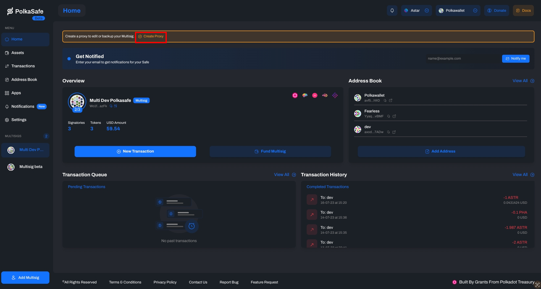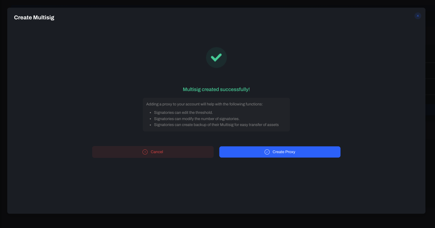 - Create Backups: Establish a backup of the multisig account, facilitating seamless asset transfers. In other words, all assets will be in the proxy account. This means that when you add or remove any signatory, the multisig address will change, but the proxy address will not. Therefore, assets in the proxy account won't be lost.