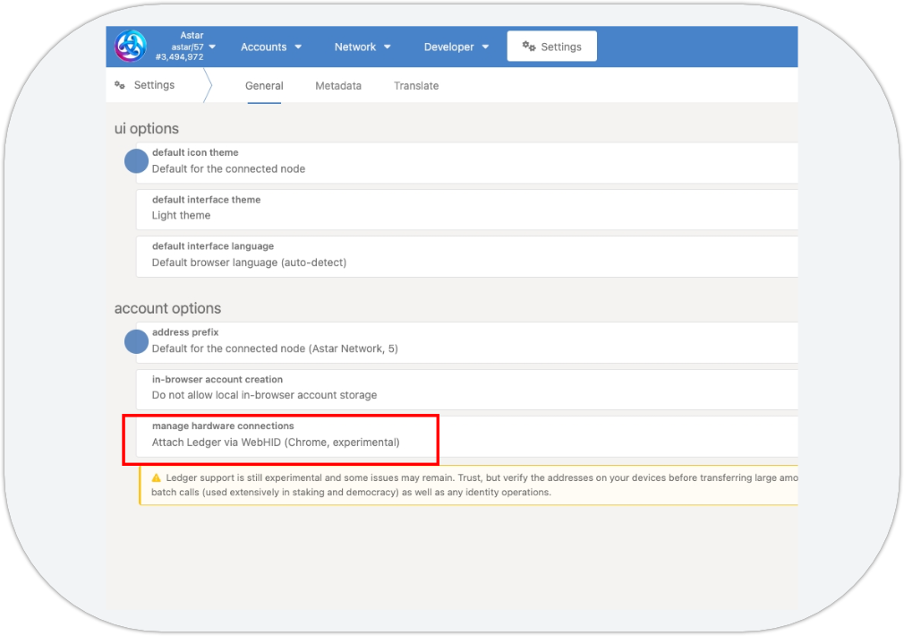- Ensure Attach Ledger via WebHID is the preferred connection method listed under account options > manage hardware connections, as shown in the image below: