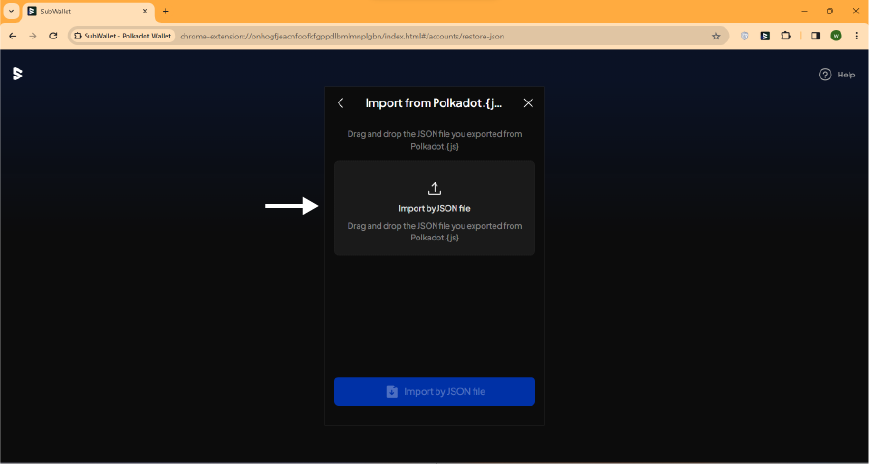 You can import a Polkadot.js account after exporting the JSON backup file. Click on the Import from Polkadot.js field to upload a file from your device, or drag and drop your JSON file into the field.