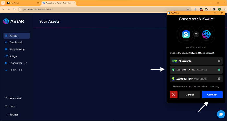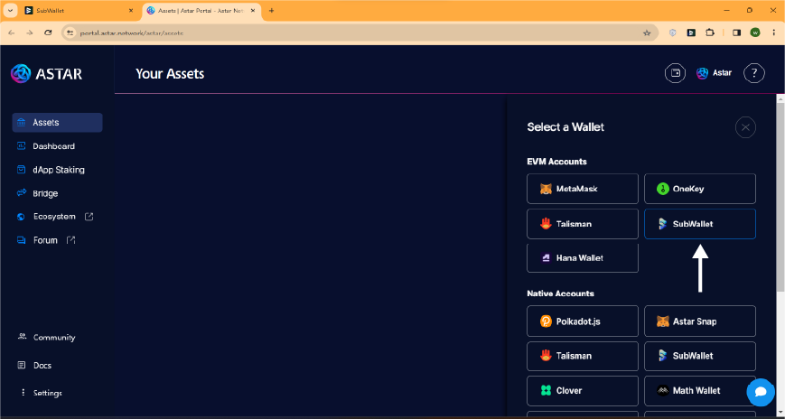 If you want to connect your Ethereum account, choose SubWallet under the Ethereum accounts section.