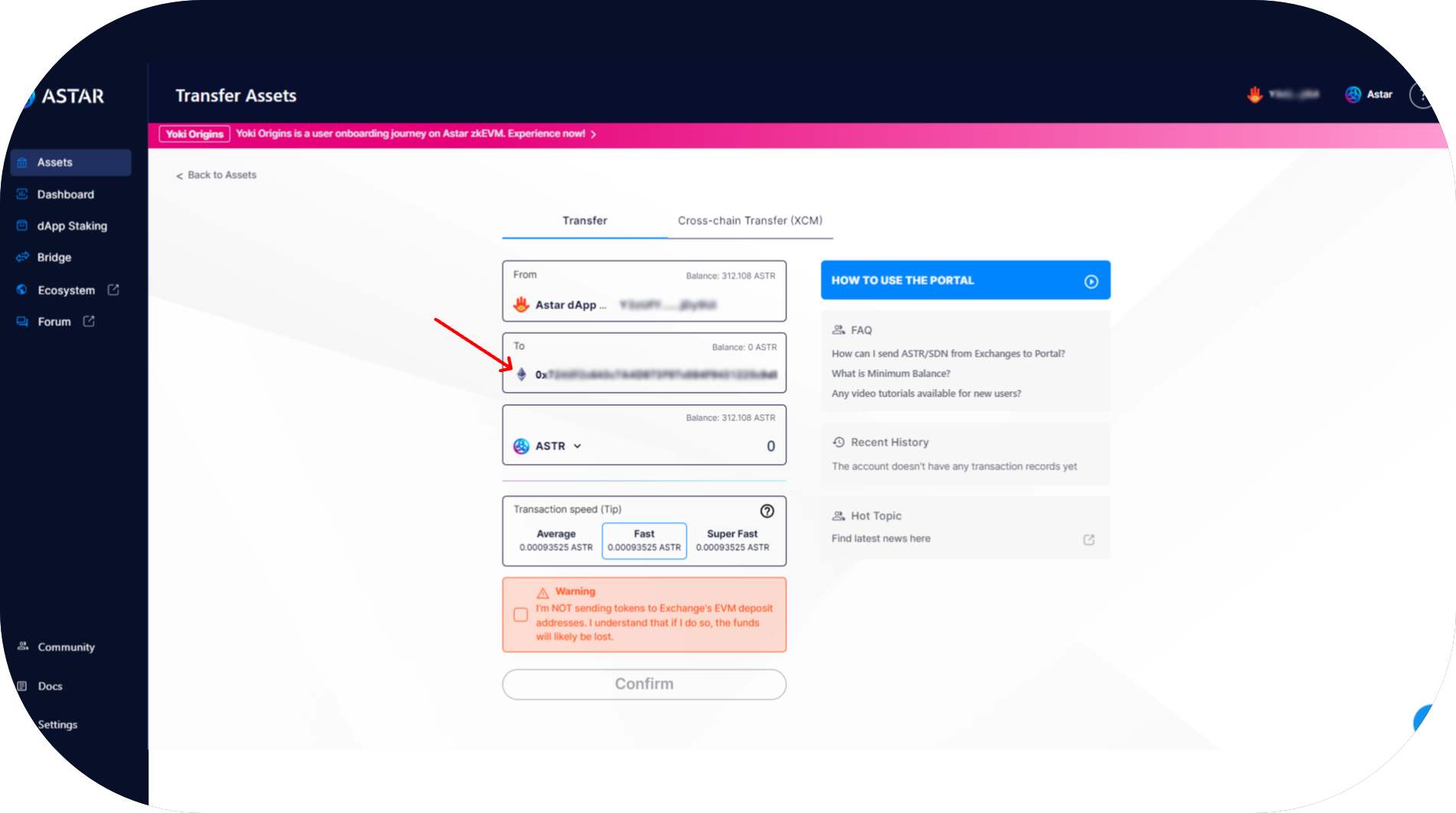 - You are now on the transfer page. Enter your Astar EVM address and the amount you want to transfer, then press
