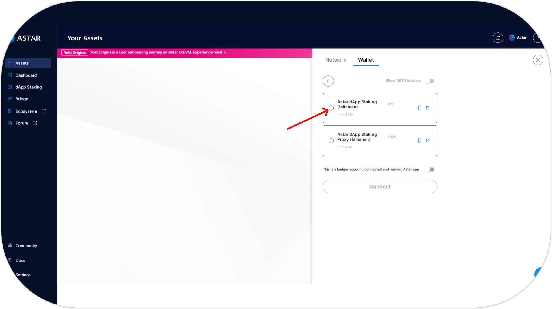 - Visit the Astar Portal, choose an EVM wallet provider (Metamask, Talisman, Subwallet, WalletConnect, etc.) and select the Astar EVM account you want to connect;
