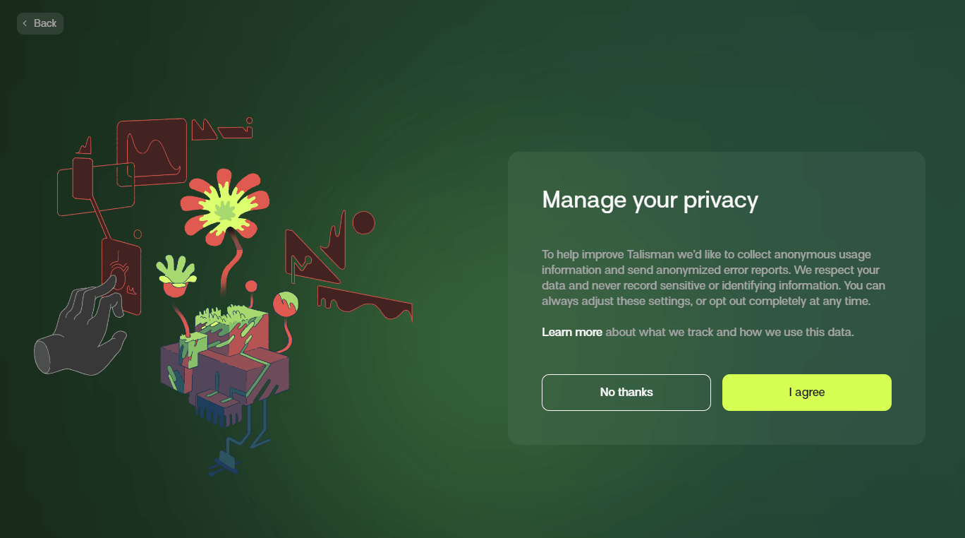 - Last step is to decide on allowing anonymous information to help talisman improve the wallet. Click any option and the setup is finished!